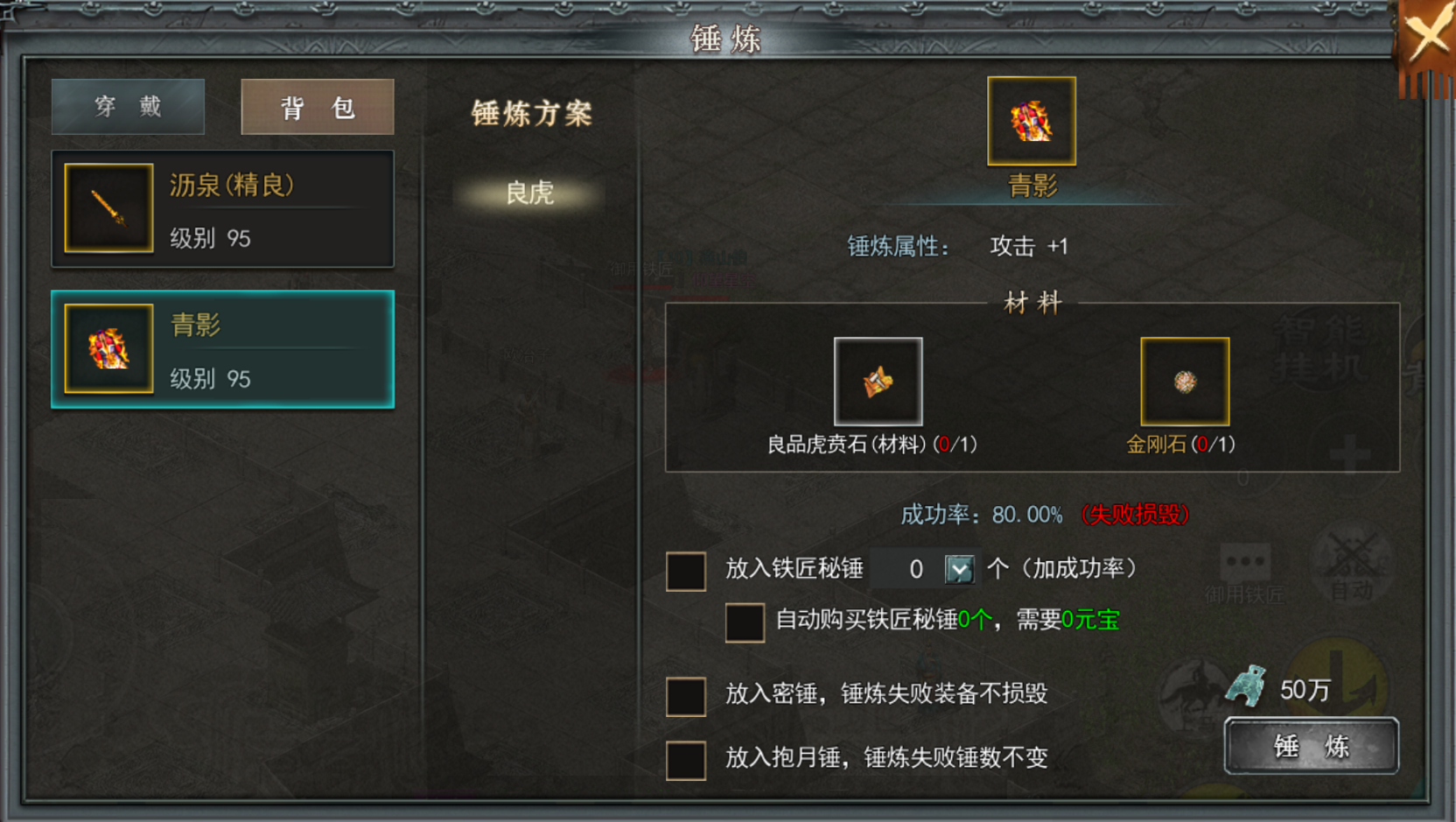 ① 密锤:打造失败时,保证装备不消失,装备属性归0;